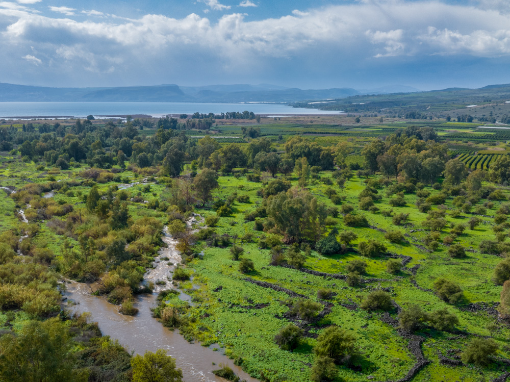 View southwest: The gate of Bethsaida (et-Tell; top center below the sun streak). The photo shows the city in relation to the plain and the Sea of Galilee (top). The Jordan Park is in the trees (top right).
