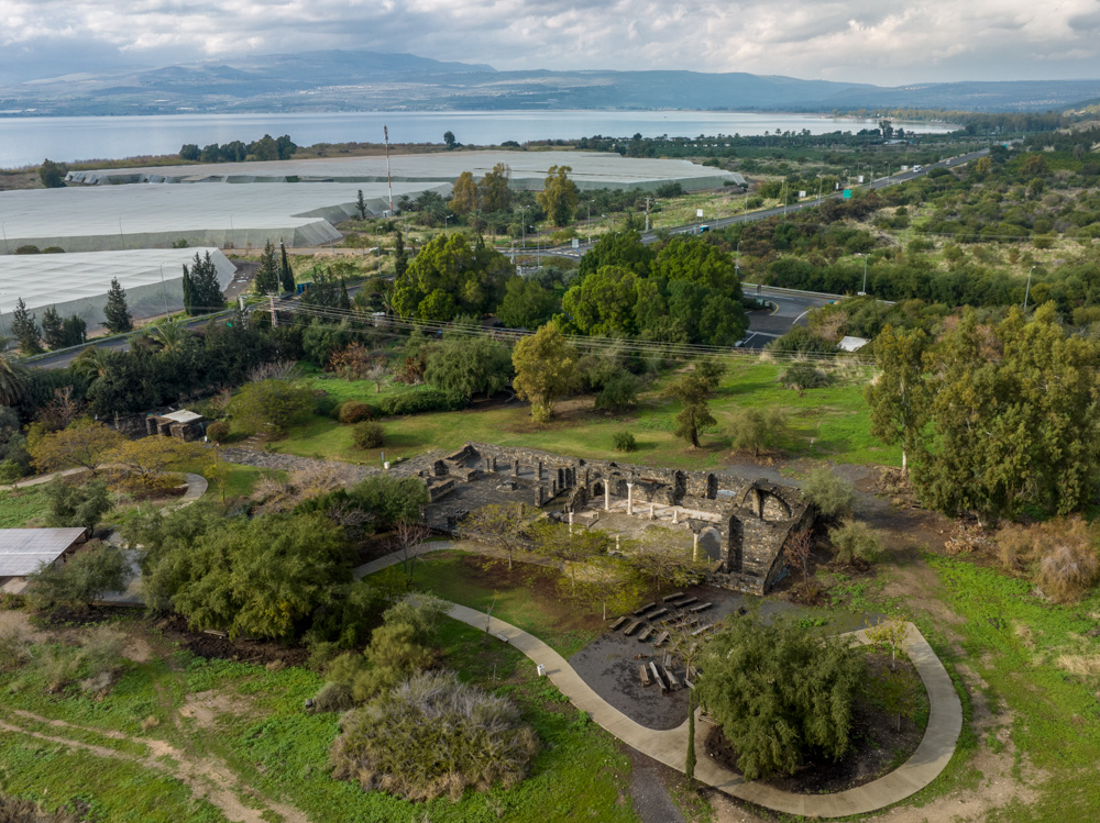 View northwest: The Byzantine Monastery and Church (bottom center). Also visible are the SEa of Galilee and Plain of Bethsaida (upper right), where Jesus fed the five thousand (see Matt. 14:13–21).