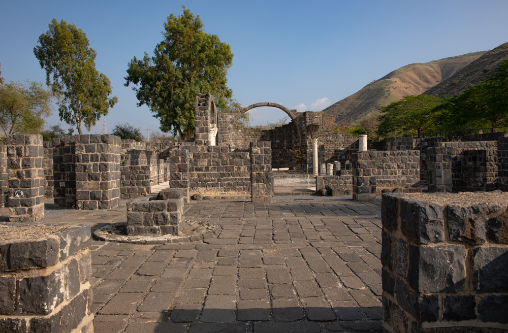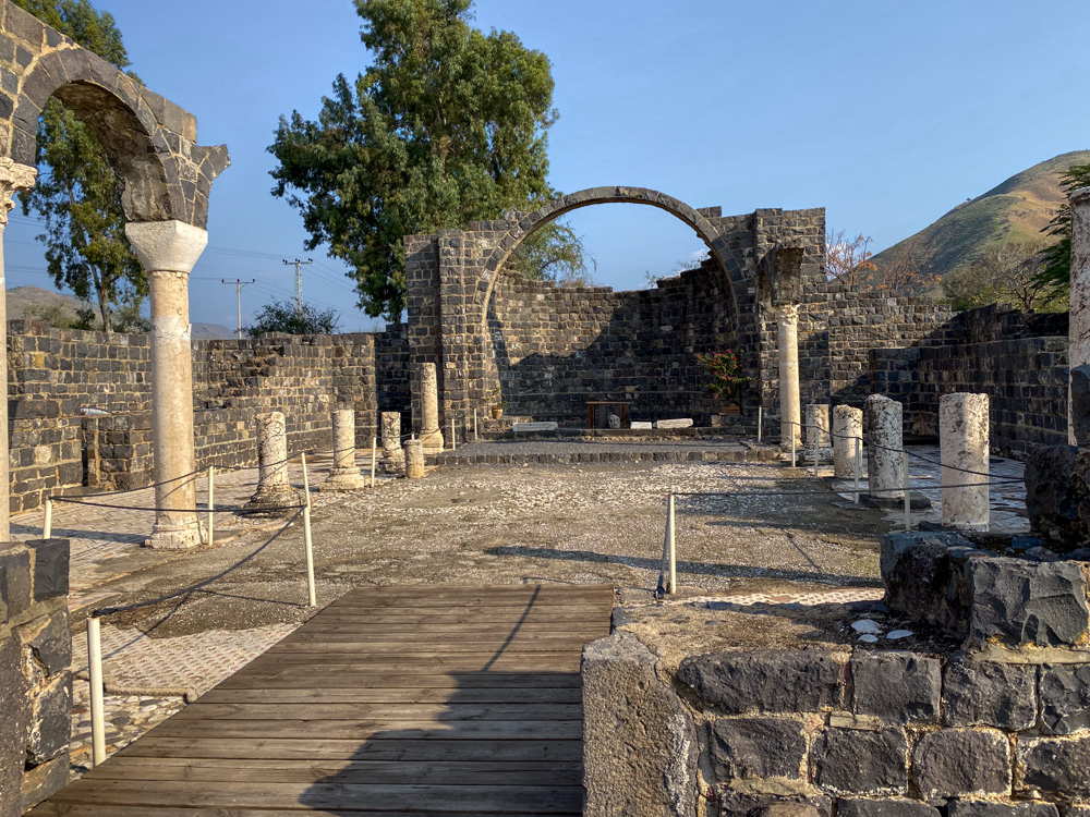 View east: Archaeologists have identified this site as ancient Kursi. It is a fifth-century AD basilica, monastery, and church with two rows of columns that divide the prayer hall from two side aisles.
