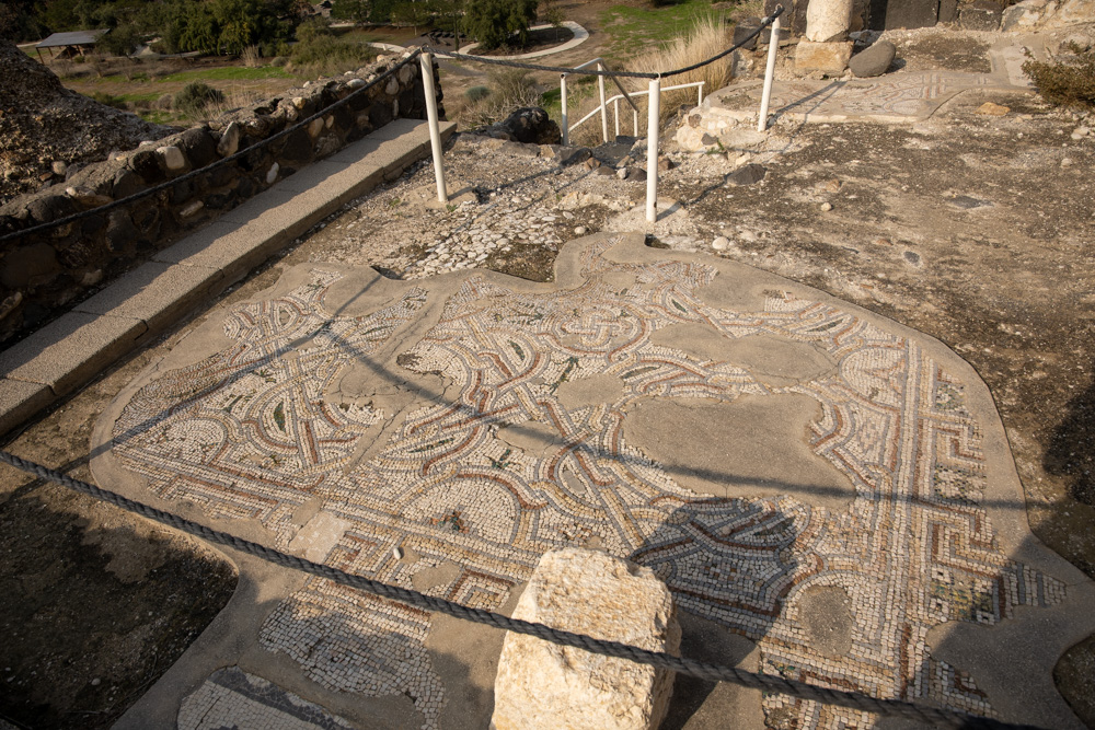 View east: One of the mosaic floors of the Holy Rock Church. Part of the apse of the church is also visible (top right).