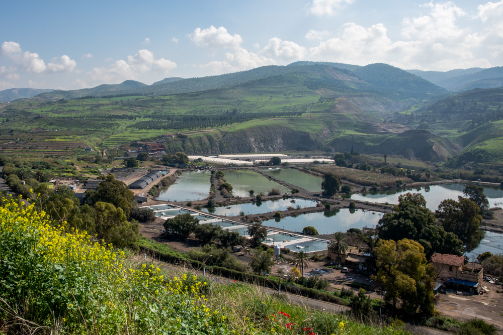 View east: Fish farms located in the Yarmuk River Valley, a little east of the hot springs at Hamat Gader. Beyond the ponds are the countries of Syria and Jordan.