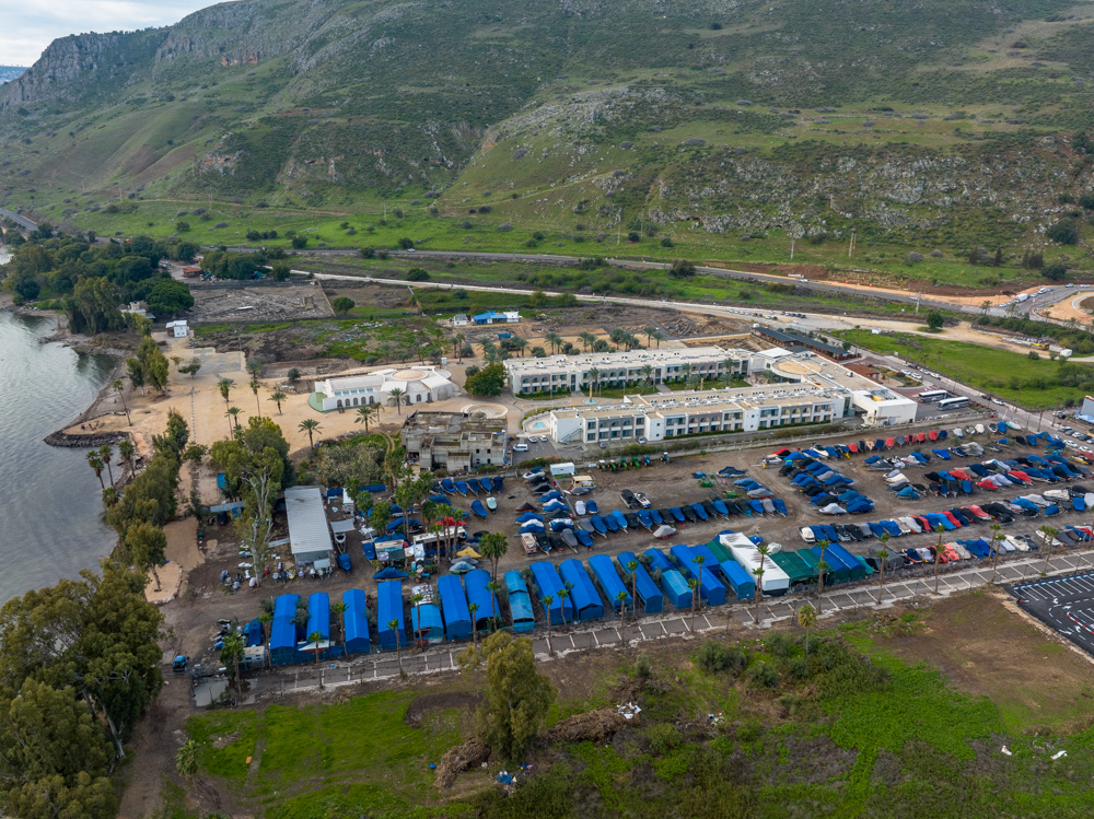 View south: Magdala church (center left) and hotel (center right). A second first-century AD synagogue was discovered across the street from the hotel (orange area) at the foot of Mt. Arbel (top right).