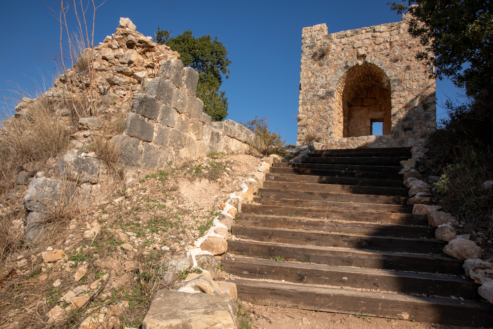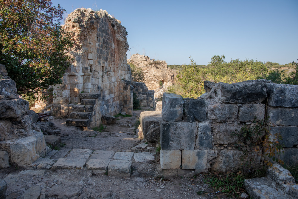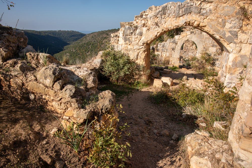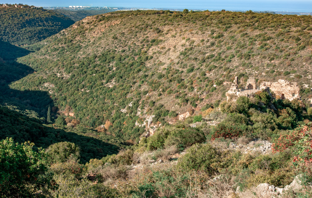 View West: The castle (center right) looks down on Nahal Keziv with the Mediterranean Sea (top) in the distance. Also pictured is the coastal town of Nahariya (top left), 8 miles (13 kilometers) to the west.
