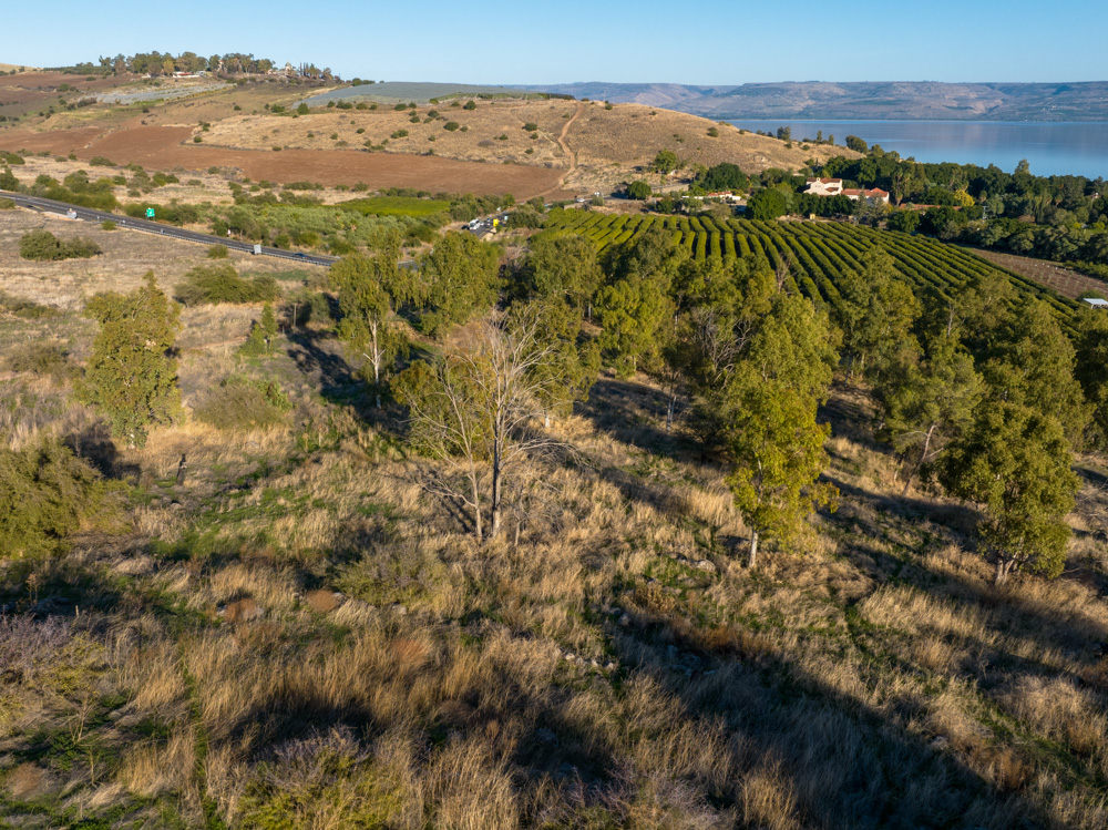 View east: The traditional Mount of Beatitudes (Top center) and Tabgha (upper right). You can see the Roman Catholic Mount of Beatitudes Chapel overlooking the mount (top left) and Sea of Galilee.