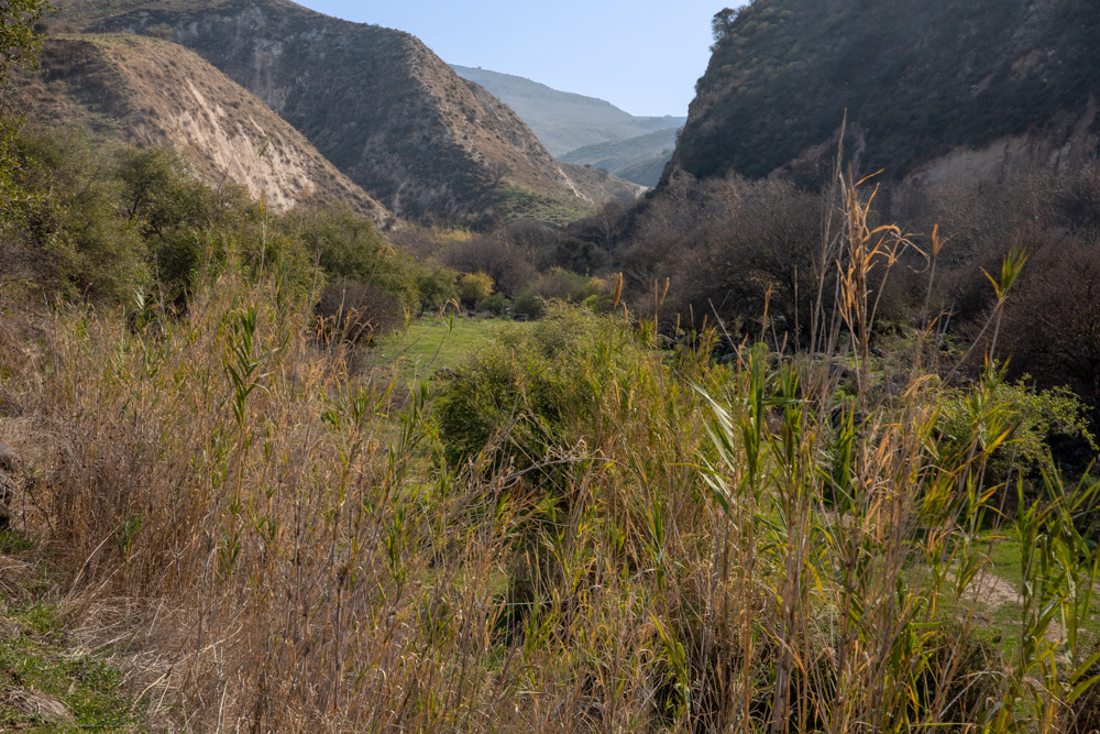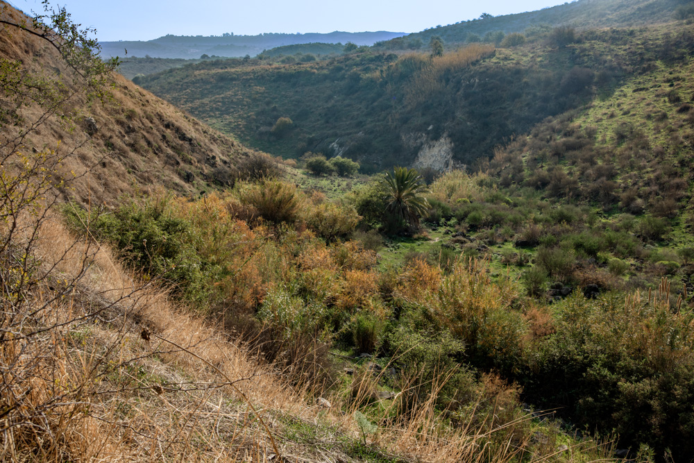 View east: I took this photo at about the halfway point between Kursi and Ein Keshatot. I had just picked up the trail, which follows the stream (right-side thicket), crossing it several times back and forth.