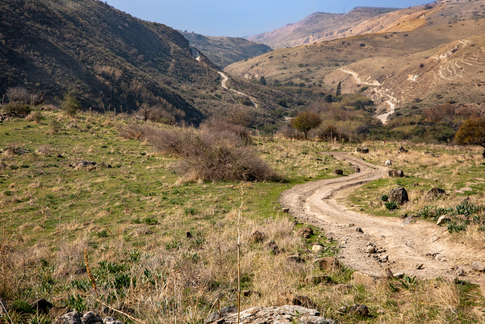View west: This photo shows the climb coming out of Nahal Samach. The road continues to Ein Keshatot on the edge of the Golan Heights, 1.5 miles (2.4 kilometers) farther.
