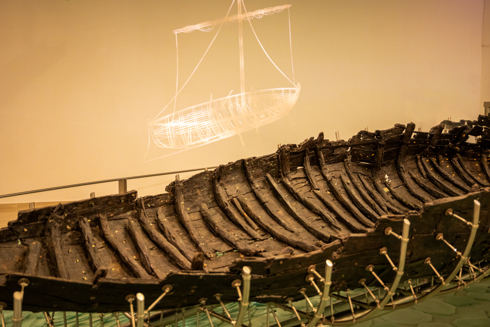The restored first-century AD Galilee Boat with a projected image above it that depicts what the boat would have looked like in antiquity.