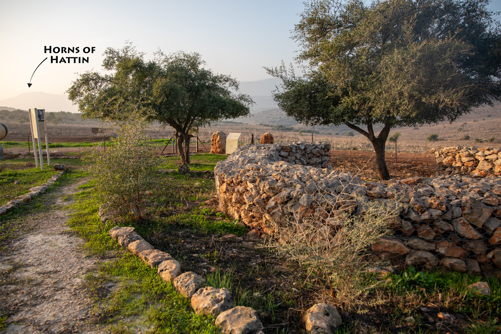 View west—Photo 8: The upper trail (left) leads toward the Horns of Hattin (see the top photo on page 192). The lower trail continues east along Wadi Hamam to the Sea of Galilee.