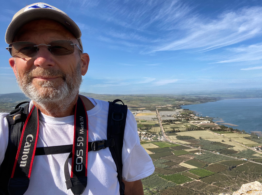 The author standing on the crest of Mt. Arbel, with the plain of Gennesaret and Sea of Galilee in the background.