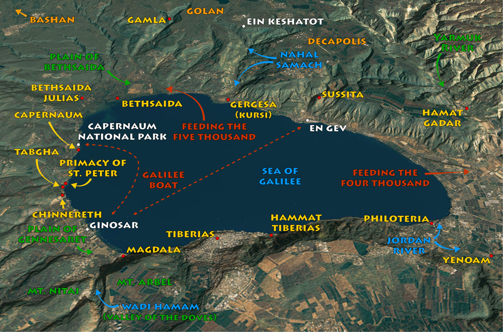 Bible Land Images uses non-destructive map and photo overlays to help you learn the land of the Bible. The map below is from the Sea of Galilee chapter. Click the map to display an enlarged view, then click it again to toggle the overlay off and on.